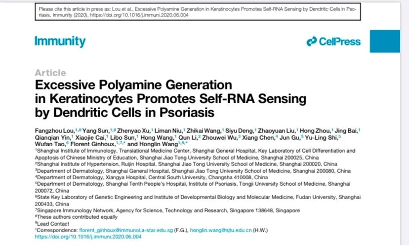 Immunity 发表题为“Excessive Polyamine Generation in Keratinocytes Promotes Self-RNA Sensing by Dendritic Cells in Psoriasis”的研究论文。