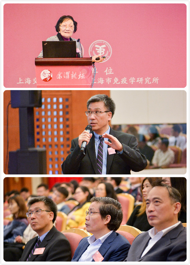 2018年11月26日,上海市免疫学研究所第二届余㵑论坛在医学院懿德楼二楼报告厅举行。论坛特邀复旦大学上海医学院中国工程院院士闻玉梅教授担任主讲嘉宾。中科院院士、上海交通大学医学院院长陈国强教授,复旦大学党委副书记、纪委书记袁正宏教授,上海交通大学基础医学院党委书记陈洪同来自交大医学院、免疫所、及周边高校、科研院所逾300名师生全程参与余㵑论坛。在论坛期间陈国强教授与闻玉梅院士亲切交谈,并感谢闻院士在耄耋之年亲自到访医学院和免疫所,为母校师生传道解惑并给予指导和关怀。余㵑教授次子余正先生也亲临论坛现场,与医学院陈国强院长、免疫所苏冰所长一同为闻玉梅院士颁发余㵑论坛荣誉证书及纪念章。闻玉梅院士受邀与免疫所苏冰所长一同为“余㵑学者”和“余㵑博士后”入选者颁发荣誉证书及纪念章。