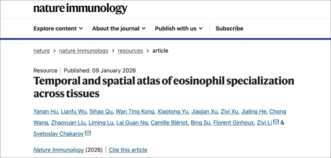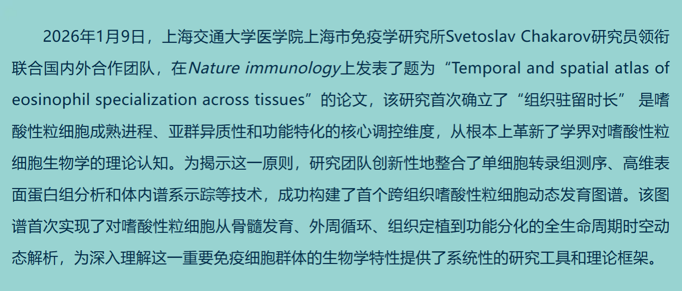 A collaborative team led by Dr. Svetoslav Chakarov from the Shanghai Institute of Immunology, together with national and international partners, has published a landmark Resource paper in Nature Immunology entitled “Temporal and spatial atlas of eosinophil specialization across tissues.”The study establishes time of tissue residency as a core principle governing eosinophil maturation, diversity, and function, fundamentally reshaping how eosinophil biology is understood across organs. To uncover this principle, the authors generated the first integrated single-cell transcriptomic and proteomic atlas of eosinophils across multiple tissues, providing an unprecedented view of eosinophil life history in vivo.