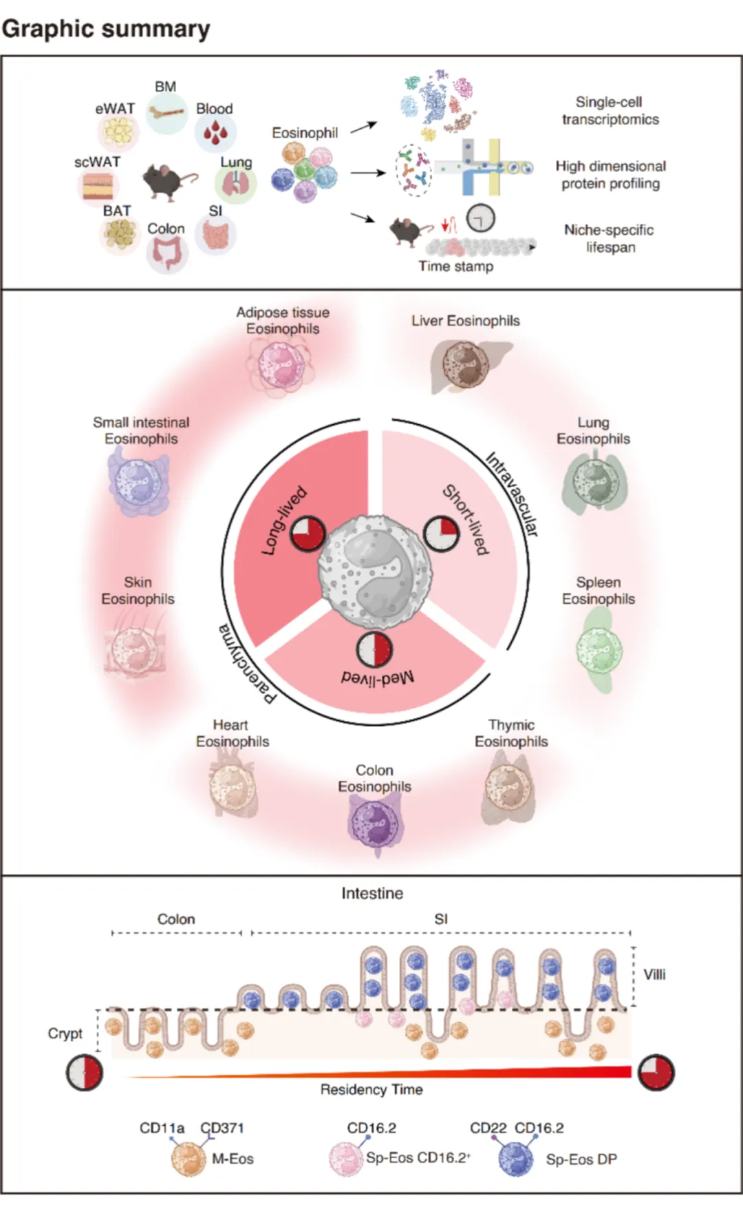 This work positions time of tissue residency as a central axis of eosinophil specialization, analogous to emerging concepts in macrophage and neutrophil biology. By delivering the first cross-tissue single-cell and proteomic eosinophil atlas and uncovering residency time as a governing principle, the study provides a foundational resource for investigating eosinophil roles in barrier immunity, metabolism, inflammation, and tissue repair. An interactive public portal accompanies the study, enabling broad community access to this resource.