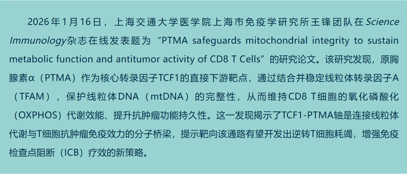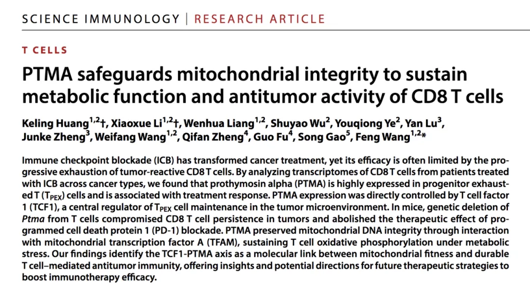本研究首次系统性地揭示了TCF1-PTMA-TFAM-mtDNA轴在连接T细胞抗肿瘤功能持续性、线粒体基因组稳定性与细胞代谢适应性中的核心作用。它不仅阐明了Tpex细胞在恶劣肿瘤微环境中维持代谢适应性的新机制,还提示了PTMA可作为预测ICB疗效的潜在生物标志物及增强T细胞免疫疗法效力的新靶点,为克服实体瘤免疫治疗疗效低下的临床难题提供了新的理论基础。
