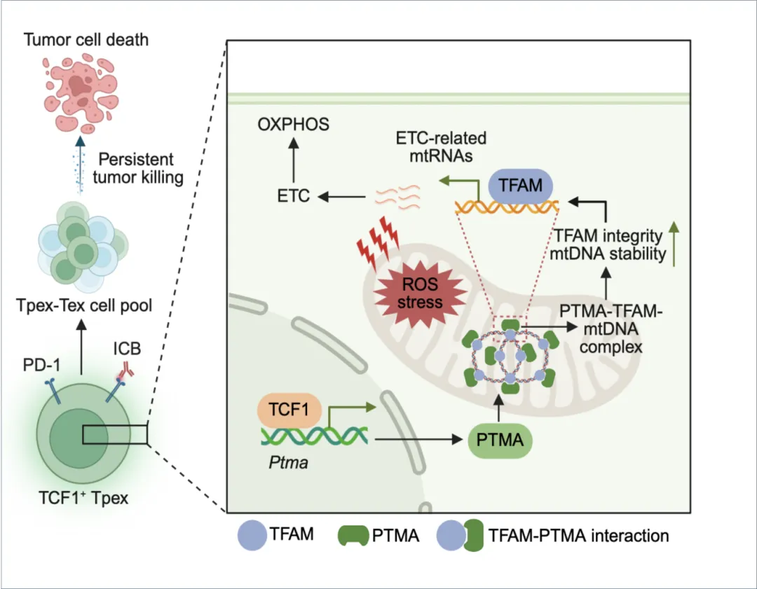 图1. TCF1-PTMA轴维持Tpex细胞线粒体代谢,提升抗肿瘤免疫持久性机制
