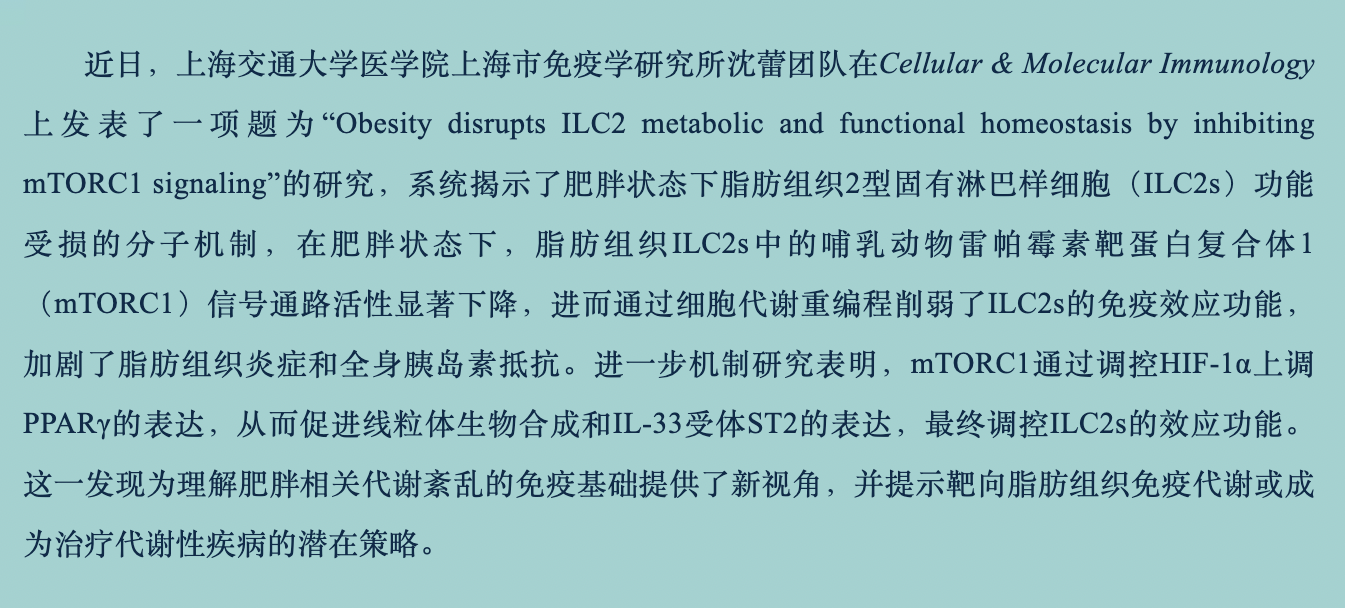 综上所述,本研究首次系统阐明了在肥胖状态下,脂肪组织微环境中的游离脂肪酸抑制ILC2s中mTORC1信号,进而通过HIF-1α–PPARγ轴损害其线粒体代谢、ST2表达及效应功能,最终导致脂肪组织炎症加剧和全身胰岛素抵抗的分子机制。该研究不仅深化了对肥胖相关免疫代谢紊乱的认识,也提示靶向脂肪组织ILC2的mTORC1-PPARγ通路,或通过改善ILC2代谢适应性,可能成为治疗肥胖相关2型糖尿病等代谢性疾病的新思路。