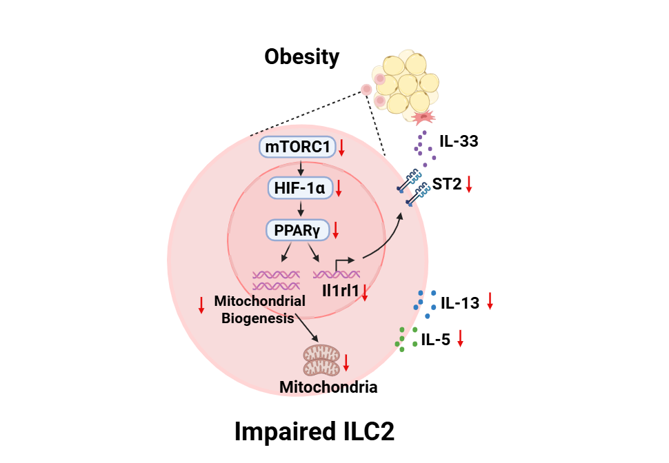 图1. 肥胖通过抑制mTORC1信号调控脂肪ILC2功能的作用机制模型