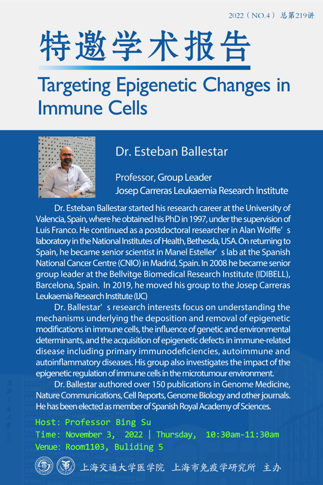 免疫所特邀学术报告第219讲 | Dr. Esteban Ballestar, Josep Carreras Leukaemia Research Institute 发布日期:2022-11-02