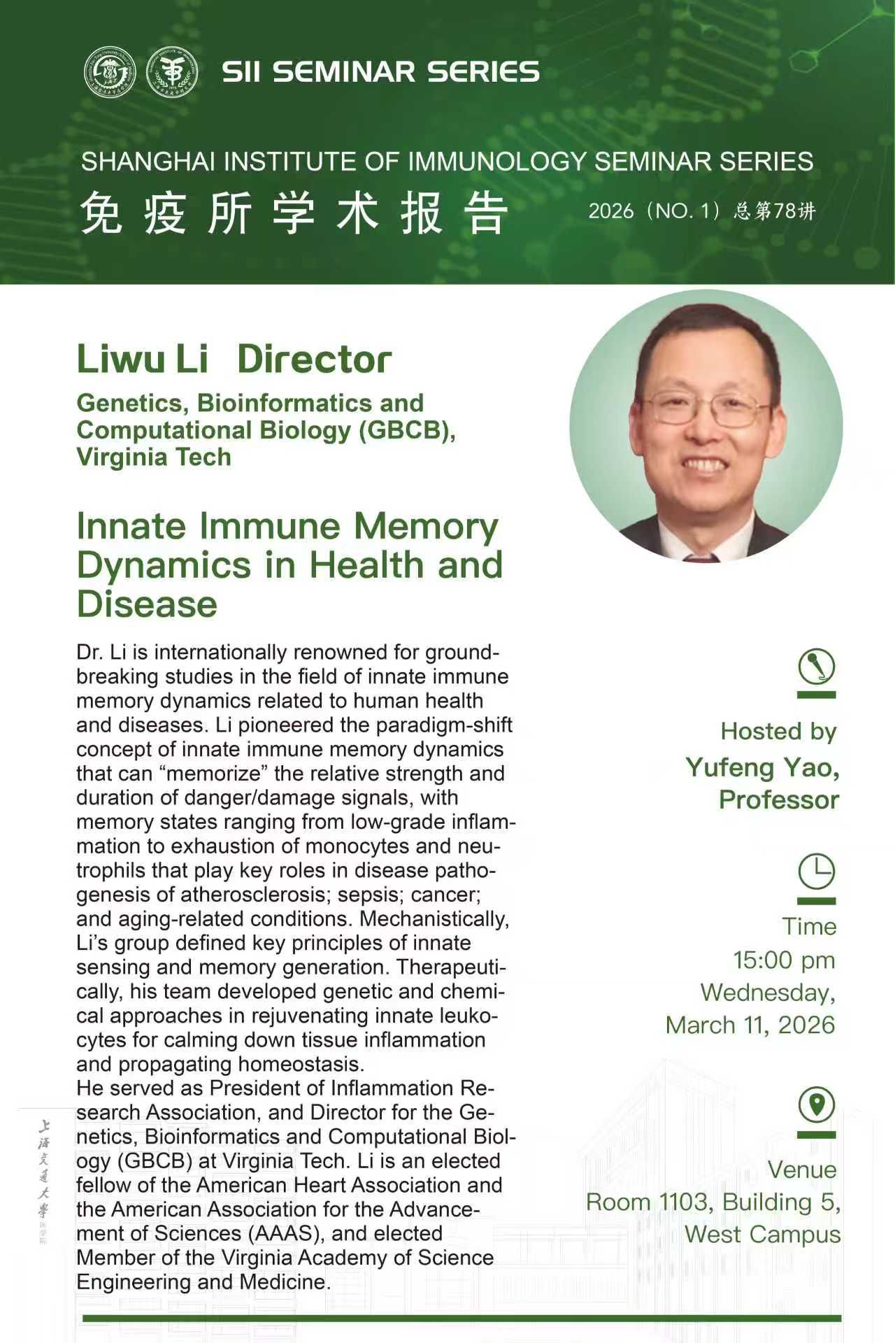 免疫所学术报告第78讲|Liwu Li Director,Virginia Tech 发布日期:2026-03-11