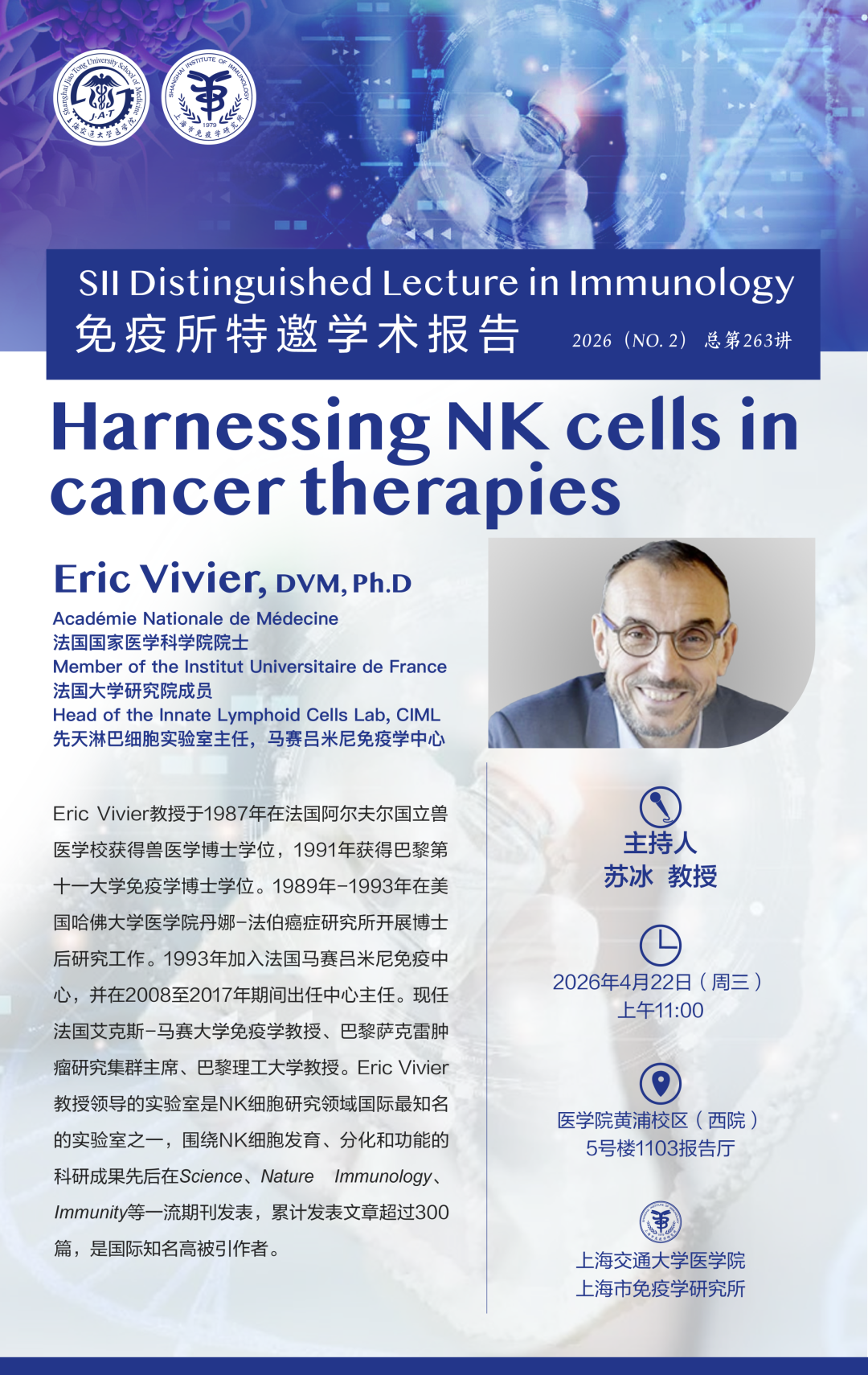 免疫所特邀学术报告第263讲|法国马赛吕米尼免疫学中心 Eric Vivier, DVM, Ph.D 发布日期:2026-04-16