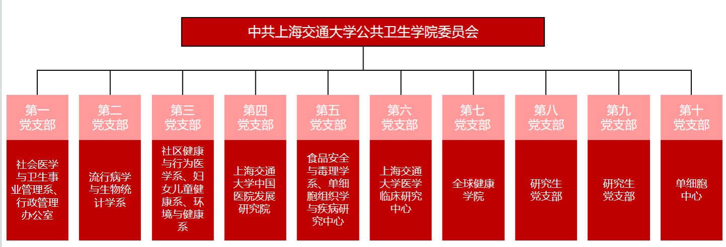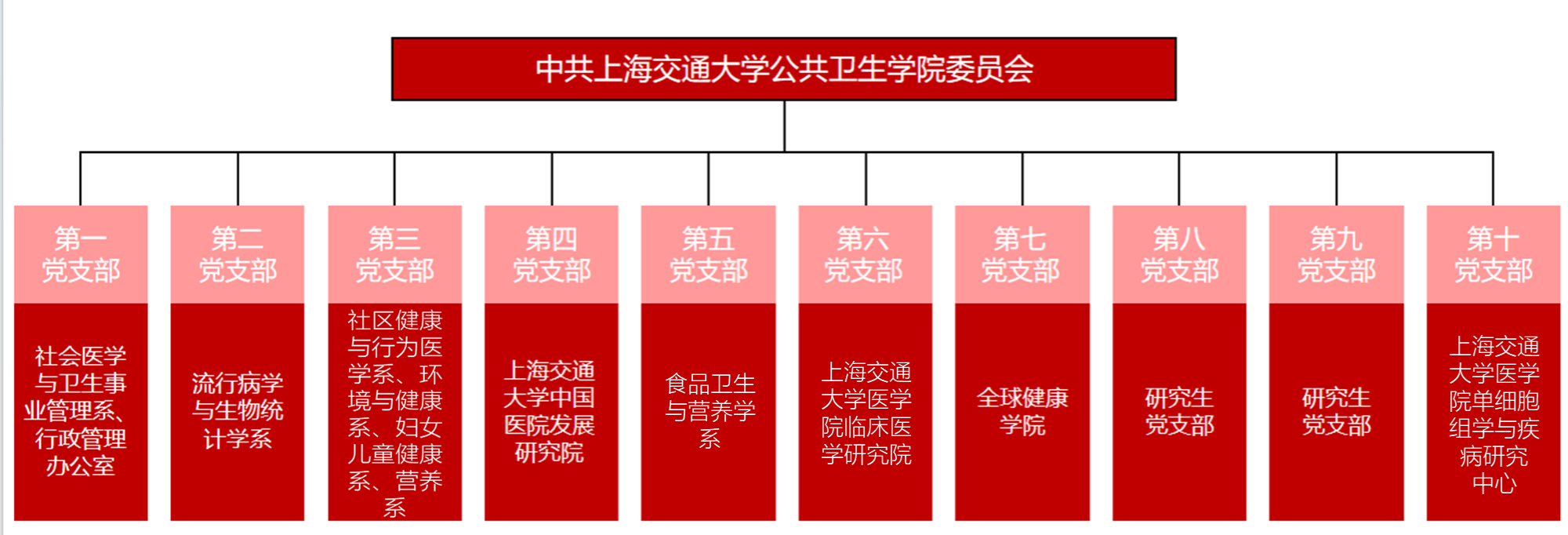 中共上海交通大学公共卫生学院总支委员会于2004年12月选举产生,2019年1月升格调整为中共上海交通大学公共卫生学院委员会。学院党委现有10个党支部。