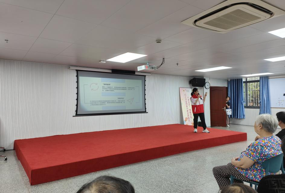 同学们用通俗易懂的语言和生动案例,向居民们展示了智能手表、健康APP等设备如何实时监测心率、睡眠、血糖等指标,并通过AI算法提前预警健康风险。现场还特别介绍了AI在糖尿病、高血压等慢性病管理中的具体应用,如智能药盒、用药提醒、饮食建议等,让居民们感受到科技为健康生活带来的实实在在的便利。