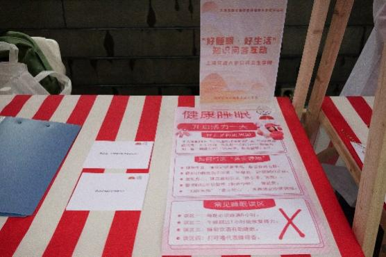 上午8:45,志愿者们整齐到场、布置展区,9:00活动正式开始。健康测评区成为居民最早围拢的地方。志愿者们为大家测量血压、指导填写“睡眠质量自评量表(SRSS)”,并根据结果提供个性化的睡眠健康建议。