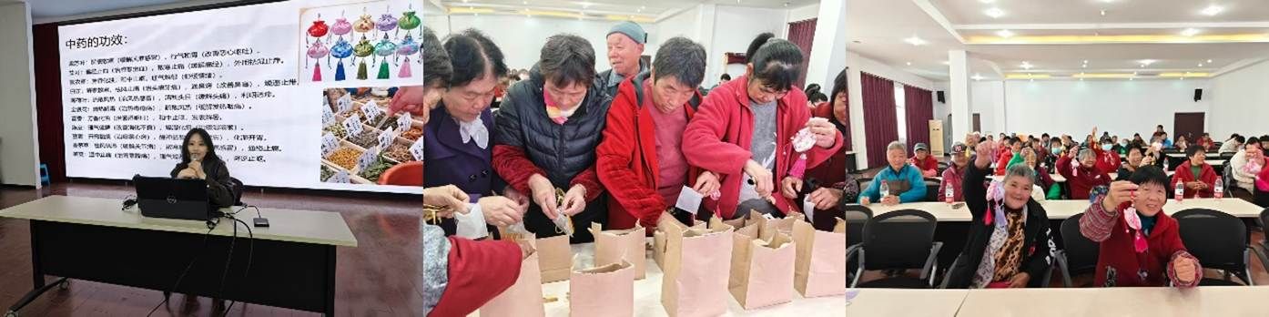 在场的老师和同学们为参与活动的老年村民有序发放制作材料,老年村民们积极参与,在指导下亲手制作具有安神助眠功效的香囊。活动现场气氛热烈,老人们在学习健康知识的同时,也体验到了动手制作的乐趣。