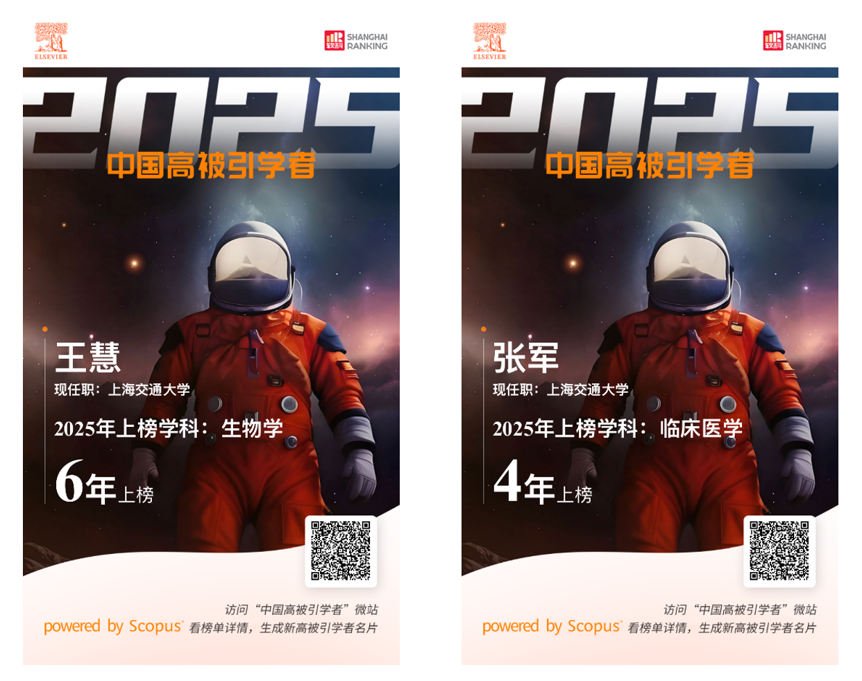近日,全球知名信息分析机构爱思唯尔正式揭晓了2025年度“中国高被引学者”榜单。该榜单的数据统计基于爱思唯尔旗下的权威引文与索引数据库Scopus。上海交通大学公共卫生学院院长王慧教授连续6年上榜,系主任张军研究员连续4年上榜。