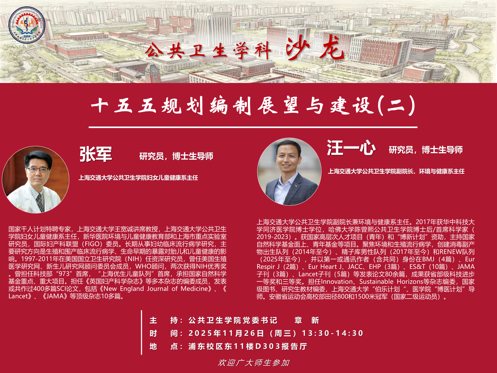 预告|公共卫生学科沙龙:十五五规划编制展望与建设(二) 浏览量:时间:2025-11-18 为凝聚学科发展共识,推动“十五五”规划高质量编制,公共卫生学院党委将举办系列学科沙龙。活动特邀各学系主任作专题报告,并设置互动问答环节,诚邀全院师生及关心学科建设的同仁现场参与和线下讨论,共话未来。通过深度交流,形成可落地的规划建议,为学院发展注入新动能。期待与您的智慧碰撞!