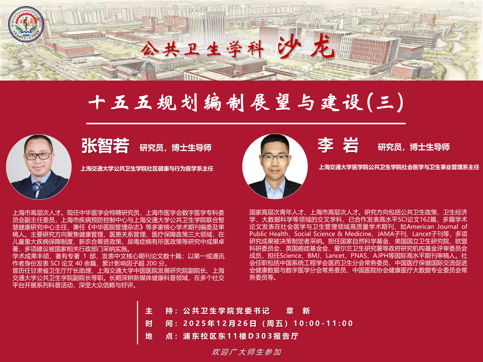 预告|公共卫生学科沙龙:十五五规划编制展望与建设(三) 浏览量:时间:2025-12-20 为凝聚学科发展共识,推动“十五五”规划高质量编制,公共卫生学院党委将举办系列学科沙龙。活动特邀各学系主任作专题报告,并设置互动问答环节,诚邀全院师生及关心学科建设的同仁现场参与和线下讨论,共话未来。通过深度交流,形成可落地的规划建议,为学院发展注入新动能。期待与您的智慧碰撞!