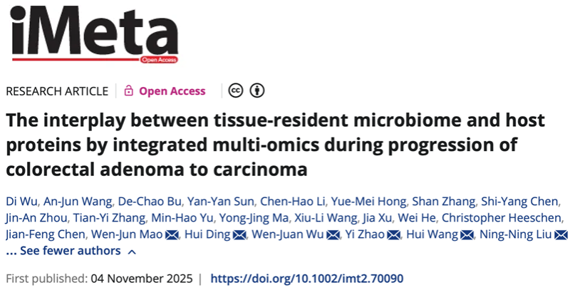 近日,上海交通大学公共卫生学院刘宁宁/王慧联合中国科学院计算技术研究所赵屹、同济大学附属东方医院吴文娟、上海交通大学医学院附属仁济医院丁慧、南京医科大学附属无锡人民医院毛文君等团队在国际领域知名期刊iMeta(IF 33.2)在线发表题为“The interplay between tissue-resident microbiome and host proteins by integrated multi-omics during progression of colorectal adenoma to carcinoma”的研究论文(https://doi.org/10.1002/imt2.70090)。