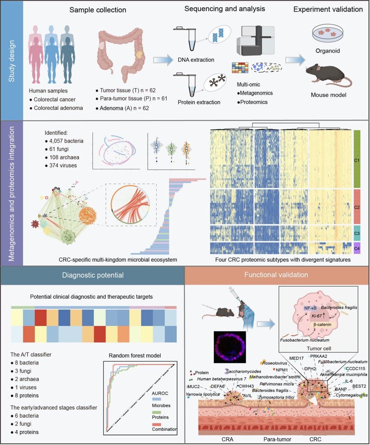 该研究整合深度宏基因组与蛋白质组学数据,系统揭示了结直肠腺瘤-癌演进过程中组织驻留多界微生物组与宿主蛋白质组的动态互作网络,并基于此构建了高精度诊断模型,为结直肠癌的早期筛查和靶向干预提供了新靶点和新策略。