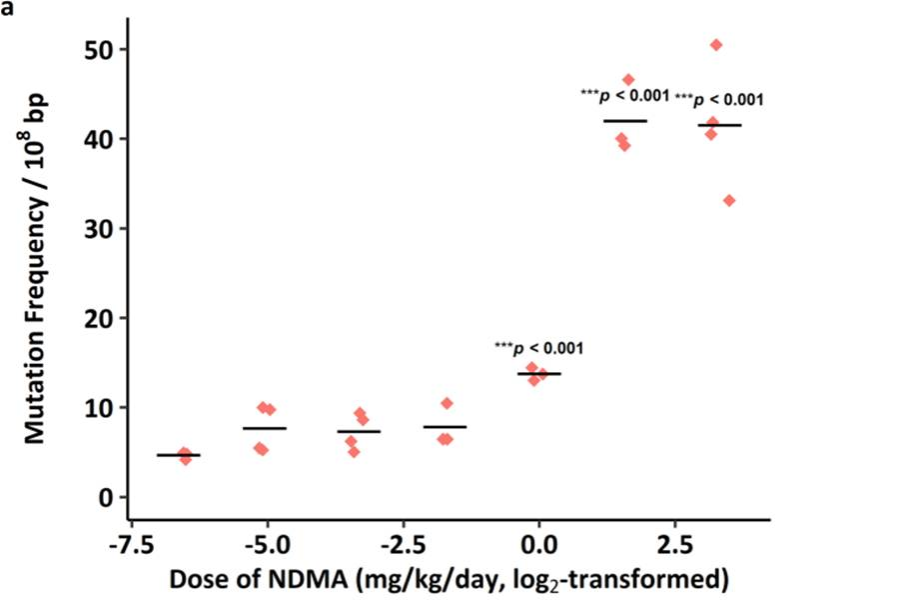 本研究通过高精度LC-MS/MS定量NDMA诱导的DNA加合物(N7-Me-Gua和O6-Me-Gua),并利用PECC-Seq检测小鼠肝脏组织中的全基因组体细胞突变。研究发现NDMA诱导的DNA加合物和体细胞突变均呈现剂量依赖性增加,突变频率在≥1 mg/kg/day剂量组出现显著升高。NDMA主要诱导CG>TA和TA>CG碱基转换,其突变谱与COSMIC Signature 11(烷化剂特征)高度相似,从分子机制上印证了其烷化致突变属性。