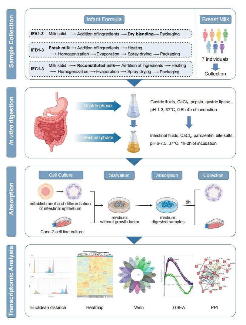 母乳被誉为婴幼儿营养的“金标准”,其富含小分子代谢物、免疫调节因子及促生长物质,难以被配方奶粉完全复刻。然而,当母乳喂养不可及时,配方奶粉仍是婴幼儿不可或缺的代乳品。现代配方奶粉虽通过添加低聚糖、乳铁蛋白等功能成分不断向母乳靠拢,但其加工工艺显著影响营养成分保留及次生代谢物生成。目前,国内外对配方奶粉的肠道吸收研究多依赖Caco-2单层细胞模型,该模型细胞类型单一、缺乏组织结构,难以真实反映婴幼儿肠道对复杂营养体系的生理应答。更为关键的是,干法、一次湿法及二次湿法等不同加工工艺如何在肠道层面塑造差异化的生物学效应,迄今仍缺乏系统性的比较研究。因此,建立一种更贴近人体生理的体外评价体系,系统解析母乳与配方奶粉、不同工艺配方之间的精细化差异,已成为婴幼儿营养研究领域亟待突破的核心瓶颈。