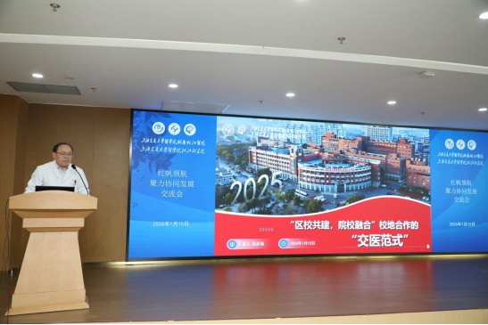 上海交通大学医学院附属松江医院副院长侯彦强就松江医院-松江研究院建设内容进行了汇报。医院与研究院在一体化建设过程中坚持打造“区校共建,院校融合”校地合作的“交医范式”。