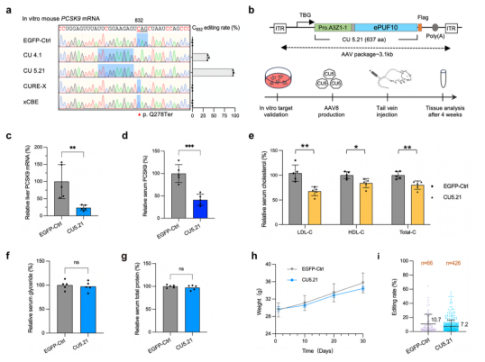 图1. CU5.21碱基编辑器有效降低 PCSK9表达并有效降低小鼠胆固醇水平。