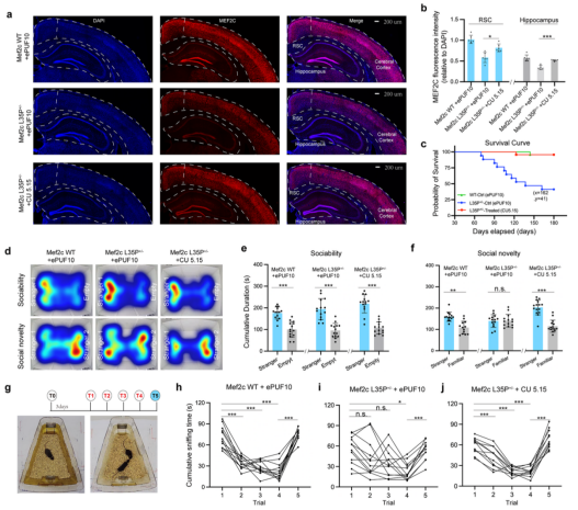 图2. CU-REWIRE5.15碱基编辑器有效恢复Mef2c孤独症小鼠的异常社交行为。