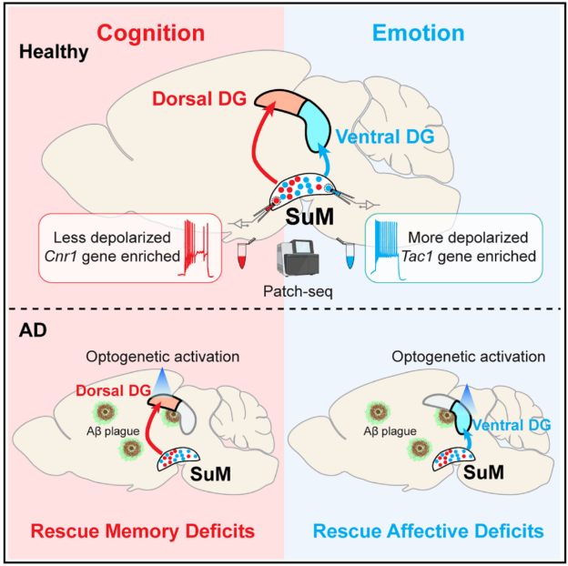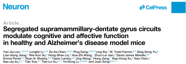 记忆和情感功能的整合与分离调控是大脑执行高级功能的基础活动特征。神经退行性疾病,如阿尔茨海默病(AD),记忆和情感障碍时常共病但机制不明。近日,上海交通大学医学院松江研究院李亚东研究员、徐天乐教授、徐楠杰教授与美国北卡罗来纳大学教堂山分校(UNC)宋娟教授、中国科学技术大学薛天教授等团队联合攻关,使用单细胞转录组测序(Patch-seq)与蛋白质组学、神经环路示踪与电生理/钙信号记录、AD模型小鼠、光/化学遗传学等方法,揭示了觉醒脑区乳头上核(SuM)分离投射记忆和情感核心脑区海马齿状回调控记忆和情感功能的关键机制,并在AD小鼠中成功干预该环路进而改善认知和情感功能。相关研究成果近期以《Segregated supramammillary-dentate gyrus circuits modulate cognitive and affective function in healthy and Alzheimer’s disease model mice》为题在《Neuron》杂志发表。
