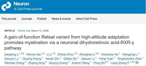 近日,上海交通大学医学院松江研究院张亮团队在Neuron上发表了题为“A Gain-of-Function Retsat Variant from High-Altitude Adaptation Promotes Myelination via a Neuronal Dihydroretinoic Acid-RXR-γ Pathway”的研究论文。该工作始于一个进化遗传学线索:视黄醇饱和酶Retsat基因的Q247R突变在多种高海拔适应物种中普遍存在,而在其低海拔近亲中则未检测到,提示该突变可能是高原适应过程中受到自然选择的遗传变异。为验证这一突变是否在中枢神经系统中发挥作用,团队展开了系统研究。