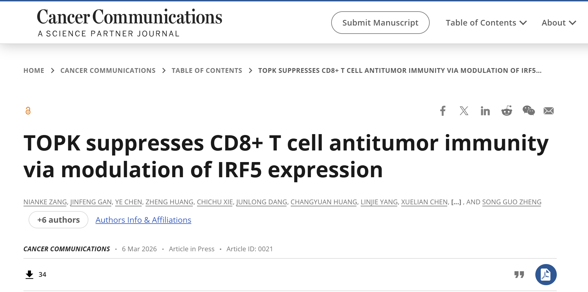 近日,国际肿瘤学顶尖期刊之一 Cancer Communications【双一区、IF=24.9】接收发表了上海交通大学医学院松江研究院/附属松江医院/细胞基因治疗研究院和创新免疫治疗全国重点实验室郑颂国教授团队的题为“TOPK Suppresses the CD8+ T Cell Antitumor Immunity via Modulation of IRF5 Expression”的最新研究成果。发现靶向T- LAK细胞来源蛋白激酶【TOPK】可显著提高肿瘤免疫环境中的CD8+ T细胞的杀伤肿瘤能力,预期未来可为恶性肿瘤的治疗提供新的手段。