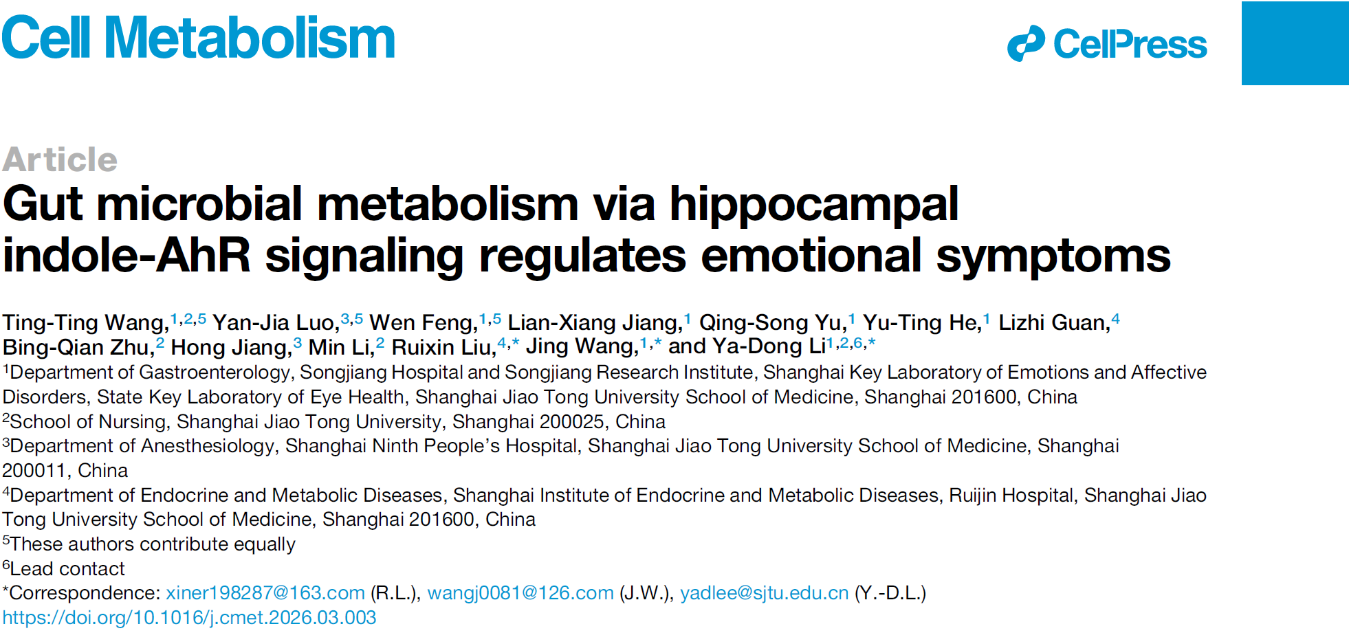 围绕IBS 肠道菌群紊乱和情感障碍,上海交通大学医学院松江研究院李亚东团队联合附属松江医院消化内科王静、附属瑞金医院刘瑞欣团队深入解析IBS情感障碍的外周代谢和中枢调控机制,提出全新治疗策略。相关成果于2026年4月1日以“Gut Microbial Metabolism via Hippocampal Indole–AhR Signaling Regulates Emotional Symptoms”为题在Cell metabolism杂志在线发表。