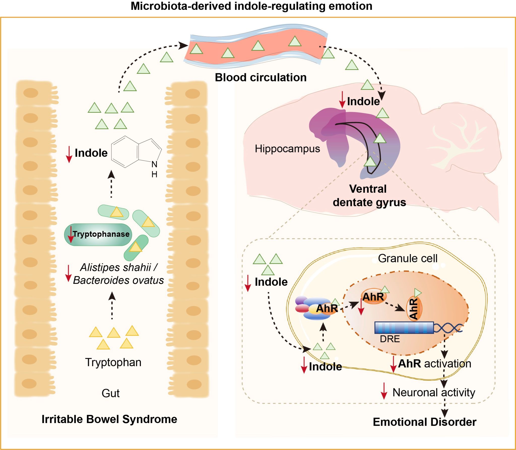 接着,研究人员进一步破解“肠脑对话”密码。代谢组学分析显示,A. shahii的缺失导致吲哚水平下降。人体吲哚的来源是肠道菌群色氨酸代谢,其中A. shahii分泌的色氨酸酶是吲哚合成的关键限速酶。肠道A. shahii丰度降低导致色氨酸酶活性降低是吲哚生成不足的关键。而吲哚在中枢调控情绪需要通过唯一受体—芳香烃受体(AhR)。肠道吲哚降低通过降低海马腹侧齿状回(vDG)颗粒细胞中AhR的核表达,降低神经元活性,最终引发情感障碍。功能实验表明,激活vDG颗粒细胞可缓解IBS小鼠的情绪症状,而抑制AhR则抵消吲哚或A. shahii移植的干预效果。
