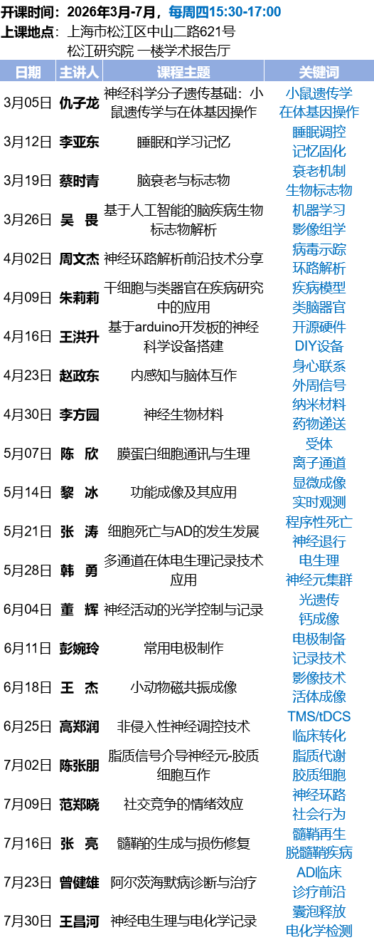 这不仅是一次知识的传授,更是一场思维与技术的碰撞。我们热忱欢迎松江研究院的研究生同学,以及交大医学院所有附属医院、所有神经科学相关专业的同学们,跨出实验室,来这里汲取前沿养分,拓宽科研视野!
