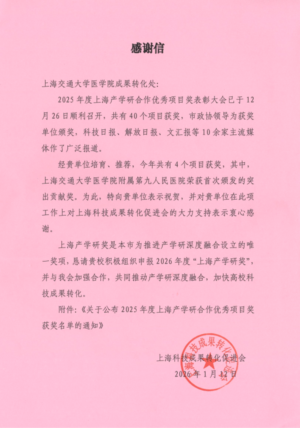 近日,上海交通大学医学院成果转化处收到上海科技成果转化促进会感谢信。在2025年度上海产学研合作优秀项目奖评选中,经成果转化处培育推荐,医学院共有4个项目获奖。附属第九人民医院斩获首次颁发的突出贡献奖,附属仁济医院“国产药物涂层球囊器械的创新研发及应用”获二等奖,附属瑞金医院“溶瘤病毒抗肿瘤药物安柯瑞上市后临床应用”、附属上海儿童医学中心与附属新华医院“国产一次性无菌腹裂治疗袋的研发与成果转化”获提名奖。促进会在信中对成果转化处的支持表示感谢,并希望双方继续深化合作,积极申报2026年度“上海产学研奖”,共同推动高校科技成果转化。