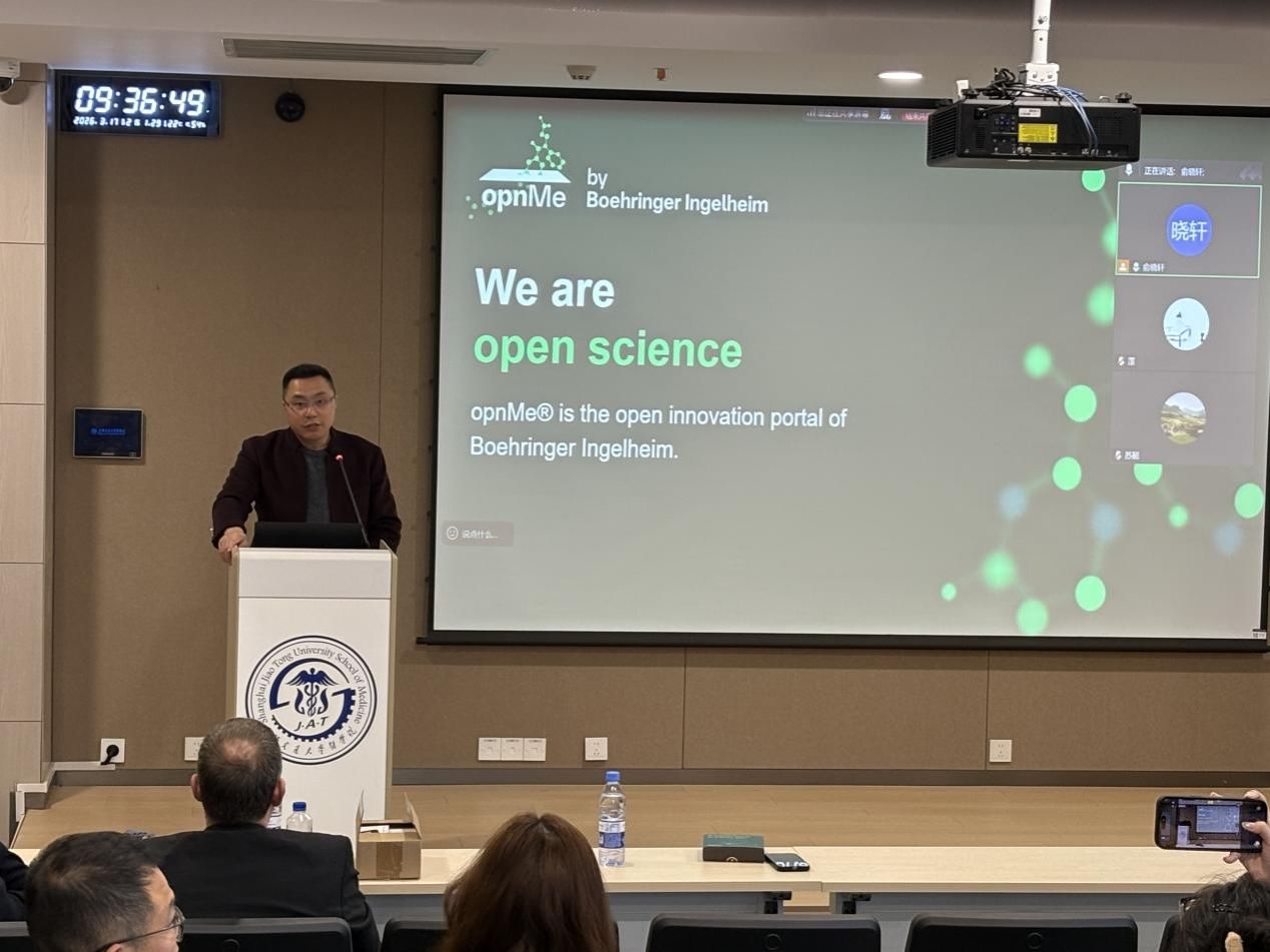 成果转化处与基础医学院共同举办科技论坛(第35期) 3月17日上午,成果转化处与基础医学院共同策划的第35期科技论坛在浦东校区科研楼 D306 报告厅成功举办。本次论坛以“探索opnMe 平台,解锁合作新机遇”为主题,采用线上线下相结合的形式,面向全院科研人员、青年教师及学生开放,旨在搭建高校与跨国药企的学术交流桥梁,助力基础医学研究成果向临床应用高效转化。 本次论坛由上海交通大学医学院成果转化处处长闫小响主持。闫小响教授在开幕致辞中指出,开放科学与产学研协同创新是当前医学研究发展的重要趋势,opnMe平台作为勃林格殷格翰开放科学战略的核心载体,为高校科研团队与产业资源对接提供了全新路径,希望通过本次讲座推动院内科研力量与全球创新资源的深度融合。 论坛特邀勃林格殷格翰开放科学全球负责人Florian Montel博士担任主讲嘉宾。Florian Montel博士在小分子药物发现领域拥有 15 年以上资深经验,曾主导多个呼吸系统和中枢神经系统药物项目,覆盖从早期研发到临床开发的全流程。他在报告中系统解析了opnMe平台的运行机制与核心价值,详细介绍了科研人员如何通过该平台获取高质量科研分子、申请研发资助,同时深入宣讲了勃林格殷格翰业务发展及许可(BD&L)策略,为院内科研团队提供了清晰的成果商业化合作路径。 在专题报告后,本次论坛设置了互动交流与一对一交流问答环节。Florian Montel博士与线上线下参会者就平台操作规范、项目申报流程、合作模式创新等问题展开深入探讨,并针对有转化意向的教师进行了深入的交流。