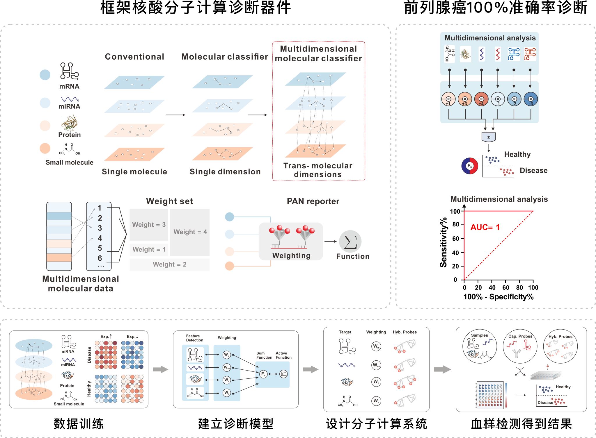 本项目面向癌症精准诊断的国家重大需求,针对单一生物标志物检测准确度低、多指标整合分析难的临床挑战,创新性地开发了基于多价编码框架核酸的信号报告系统,实现了核酸、蛋白质及小分子等多维生物标志物的统一信号转换与智能权重分配,结合大数据分析与DNA分子计算构建高精度诊断模型,在前列腺癌临床验证中达到 100% 诊断准确率(AUC = 100%),显著优于传统PSA检测(仅40%-60% 准确率)。技术核心创新点包括:1)DNA框架纳米结构的可编程设计,实现信号分子(荧光、酶、纳米金等)原子级精度的定价修饰与信号线性输出(R²>0.998);2)多维度生物标志物协同分析算法,通过逻辑回归模型优化权重组合结合界面DNA计算实现精准诊断;3)低成本电化学检测系统(单次检测6.3美元),兼容可穿戴设备集成,适用于基层医疗。项目由上海交通大学医学院附属仁济医院主导研发,知识产权归属明确,已获授权专利1项,技术成果发表于《Nature Nanotechnology》,相关技术团队获上海市自然科学奖一等奖,技术成熟度达TRL 4级。目前与仁济医院泌尿外科、肝脏外科合作开展研究者发起临床研究(IIT),重点推进前列腺癌和肝癌的早期诊断应用,未来可扩展至肺癌、肾癌、阿尔茨海默症等疾病的多维分子分型,市场潜力巨大。