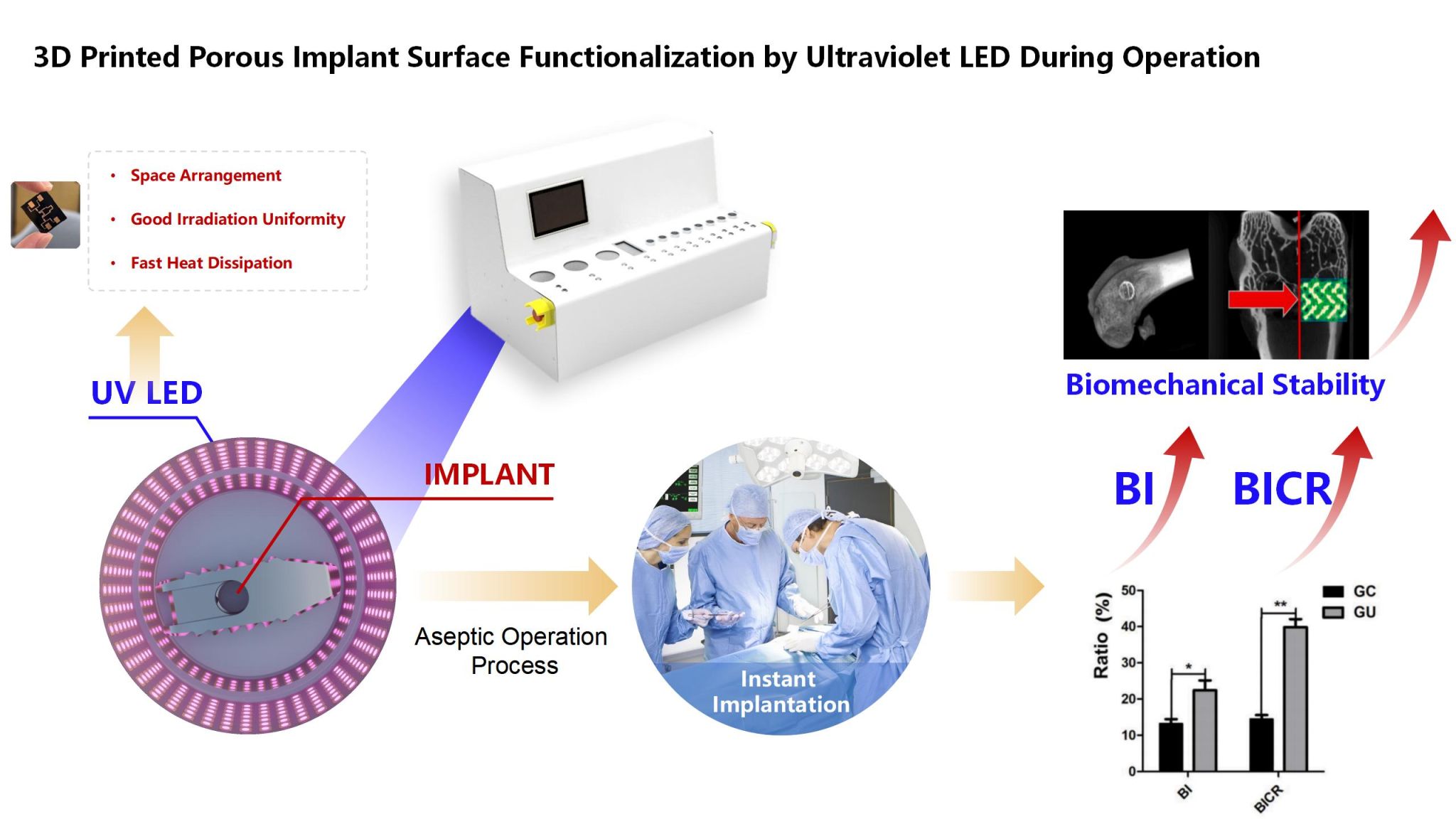 光功能化(photofunctionalization)照射仪是一种金属(主要为钛合金)表面 改性的紫外线照射仪器,处理后的内植物具备超骨整合效应,缩短术后的康复时 间,减少术后并发症发生。光功能化的表面改性技术被认为是目前唯一未引入其 他外界物质的表面改性方法,相对于载药或者金属离子等涂层类的表面改性技 术,其具有安全性高且不改变内植物固有机械性能等优势。该设备作为全球唯一 的光功能化照射设备,在骨科加速康复领域拥有良好的应用前景。