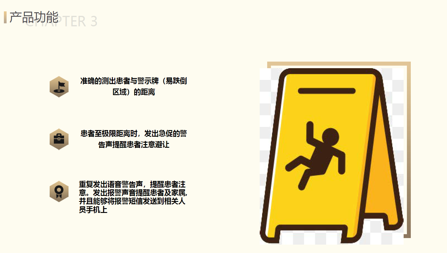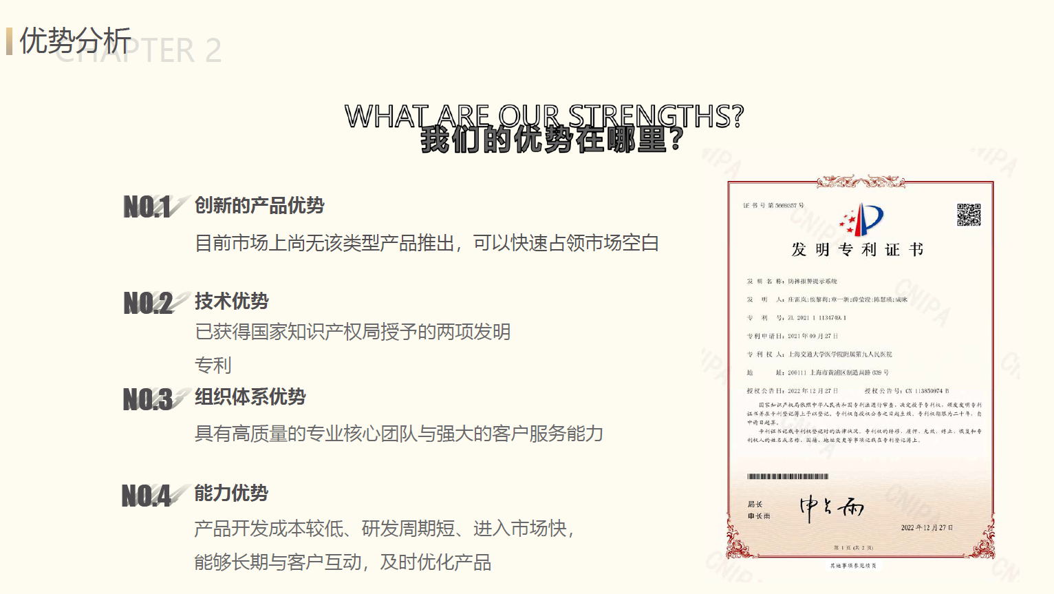 经过专利代理机构检索分析,发现本项目两项授权发明专利所保护的“防摔报警提示系统”,其中的光幕屏障由红外传感器、处理器和报警装置组成,结构并不复杂,易于实施;不仅可以单独生产制造和单独销售“防摔报警提示系统”这个专利产品,也可以如前所述嵌入目前已有的报警设施、防摔产品中。而且两项发明专利保护了解决同样问题项下的两个不同的技术方案,组成了较完善的专利保护壁垒,具有较高的法律价值。