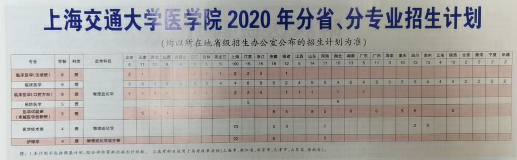 上海交通大学医学院2020年分省、分专业招生计划(一本批次及提前批次)