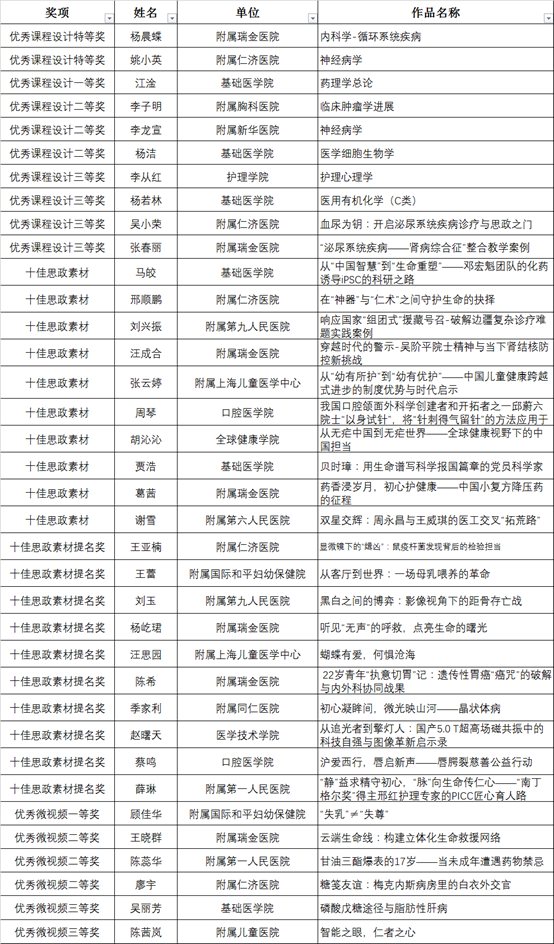 网上公示 当前位置: 首页 >> 信息公开栏目 2025年度上海交通大学医学院医学专业课程思政设计竞赛评审结果公示 作者:浏览量:时间:2025-12-15 为进一步加强高校教师思想政治工作,提升医学院基础与临床专业教师思政育人的意识和能力,充分发掘每一门医学专业课程蕴含的育德功能,更好地在课程教学中实现育人效果,特举办2025年度医学专业课程思政设计竞赛。经专家评审,现将2025年度医学专业课程思政设计竞赛评审结果公示如下: (各奖项按姓氏笔画排序) 特此公示。 如对以上评审结果有异议,请于12月19日前以书面形式向医学院党委教师工作部反馈。 联系电话:63846590转776123 电子邮箱:jgb@shsmu.edu.cn 上海交通大学医学院党委教师工作部 2025年12月15日