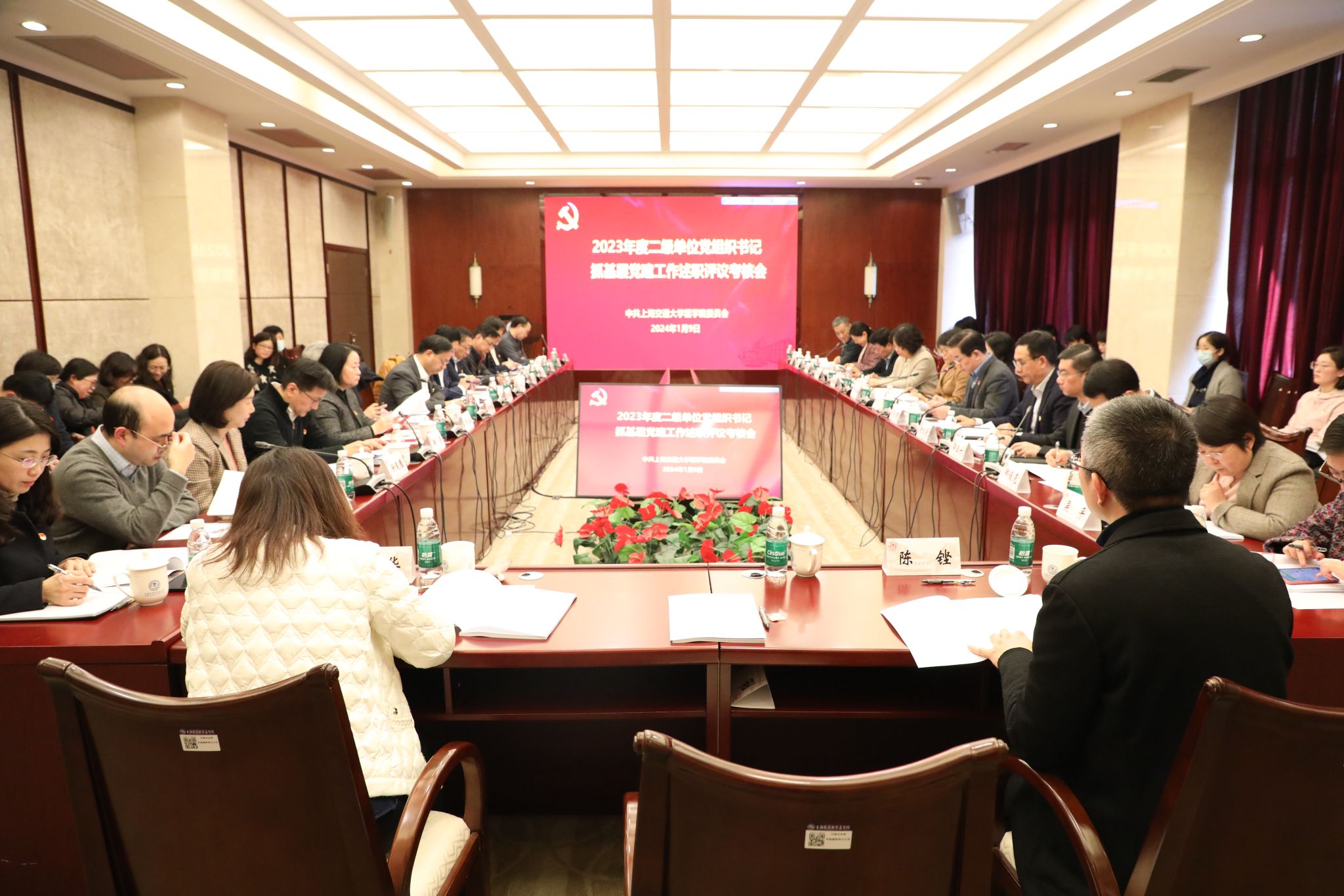 为深入学习贯彻习近平新时代中国特色社会主义思想和党的二十大精神,学习贯彻全国和上海市组织工作会议精神,推动系统各单位落实全面从严治党主体责任,根据上级党委部署要求,2024年1月9日下午,医学院党委召开2023年度二级单位党组织书记抓基层党建工作述职评议考核会。市教卫工作党委一级巡视员郑锦、市卫健委干部人事处二级调研员吴平、市教卫工作党委组织干部处三级主任科员姜舒婷到会指导。医学院领导班子成员,各二级单位党委书记,院本部相关部门负责人,二级单位党办主任、组织部门负责人、专职组织员,系统部分“两代表一委员”等40余人与会。会议由医学院党委副书记、院长范先群主持。