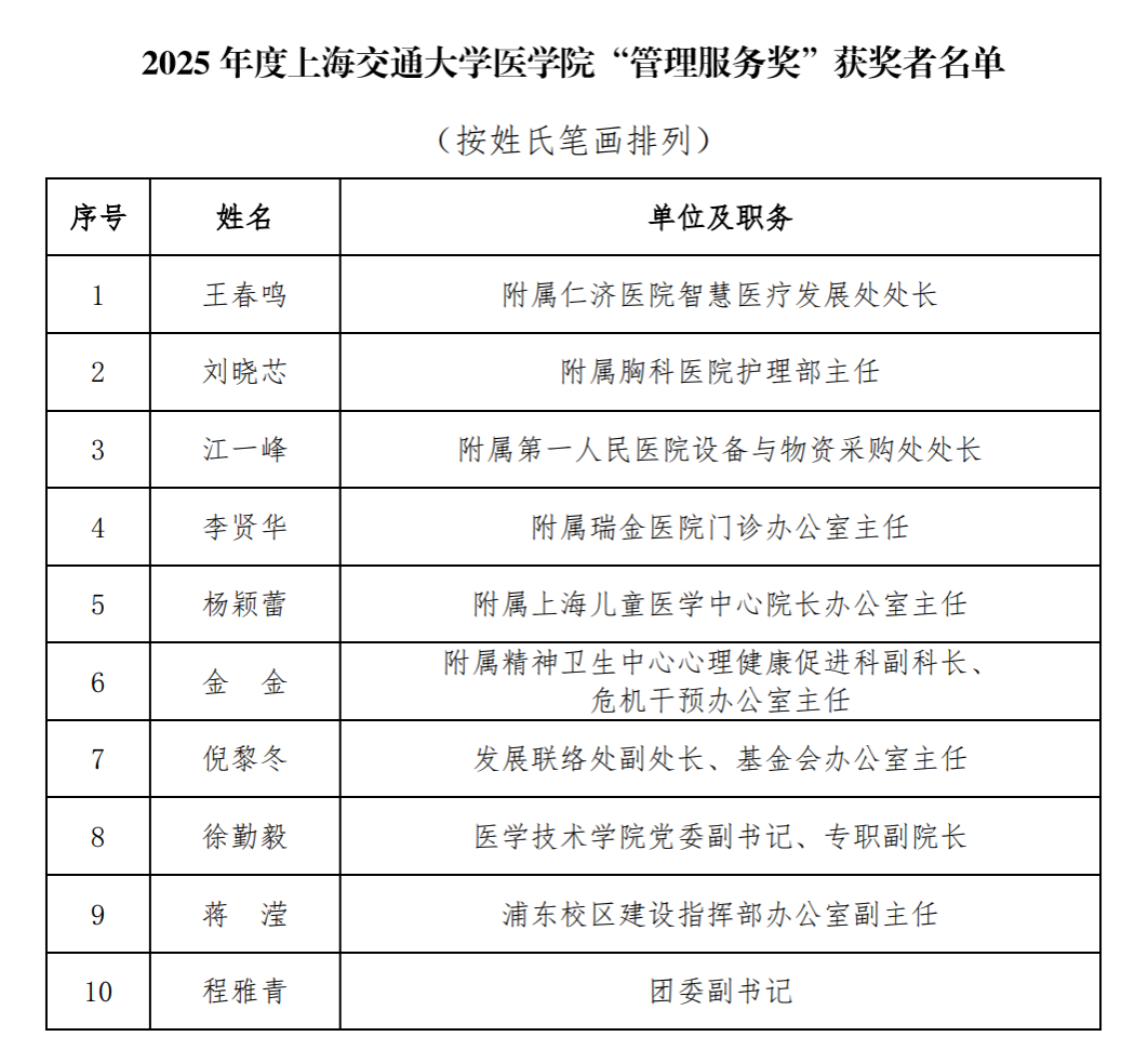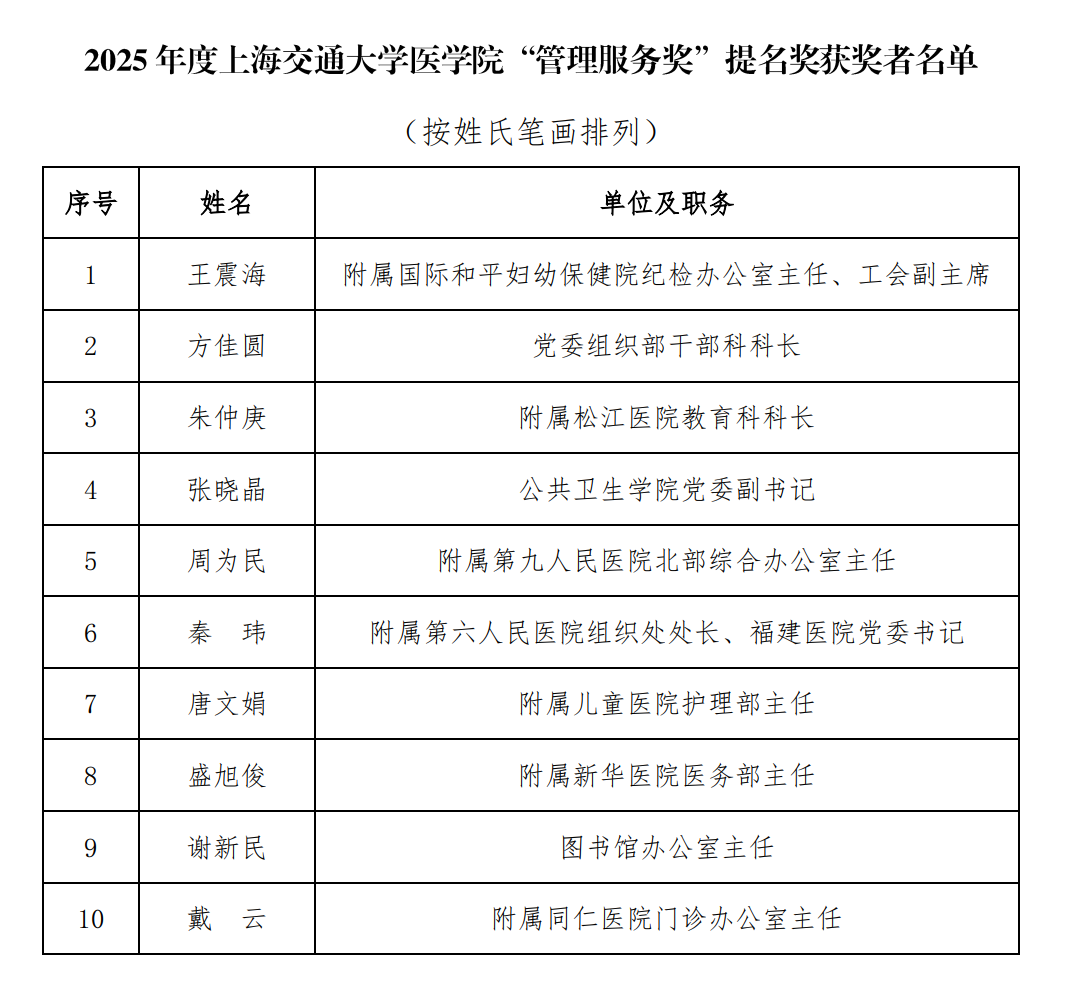根据《上海交通大学医学院“管理服务奖”实施办法》,在各二级单位推荐、公示的基础上,经过院本部评选、医学院终审答辩,医学院党委常委会讨论,同意推选以下20位同志分别获2025年度上海交通大学医学院“管理服务奖”“管理服务奖”提名奖。现将名单进行公示,公示期为2025年12月10日至2025年12月16日。