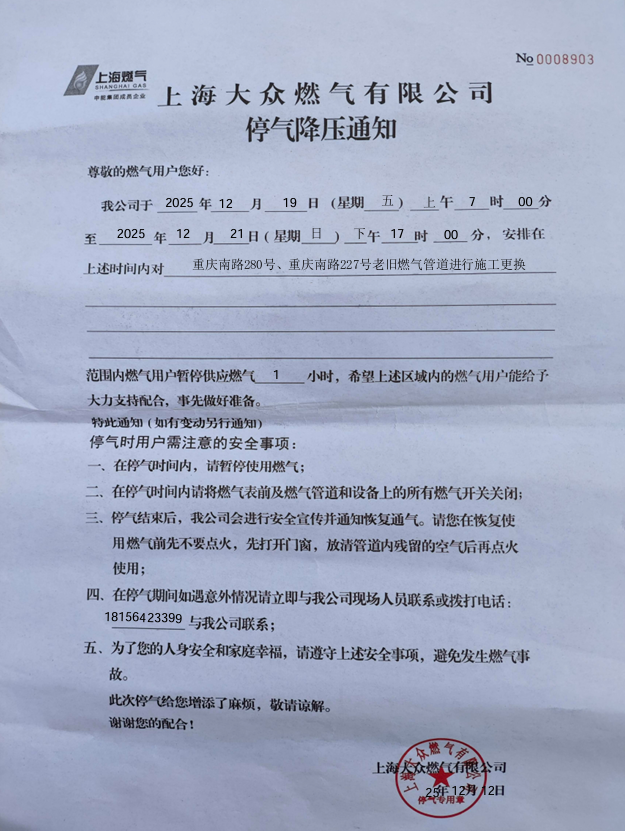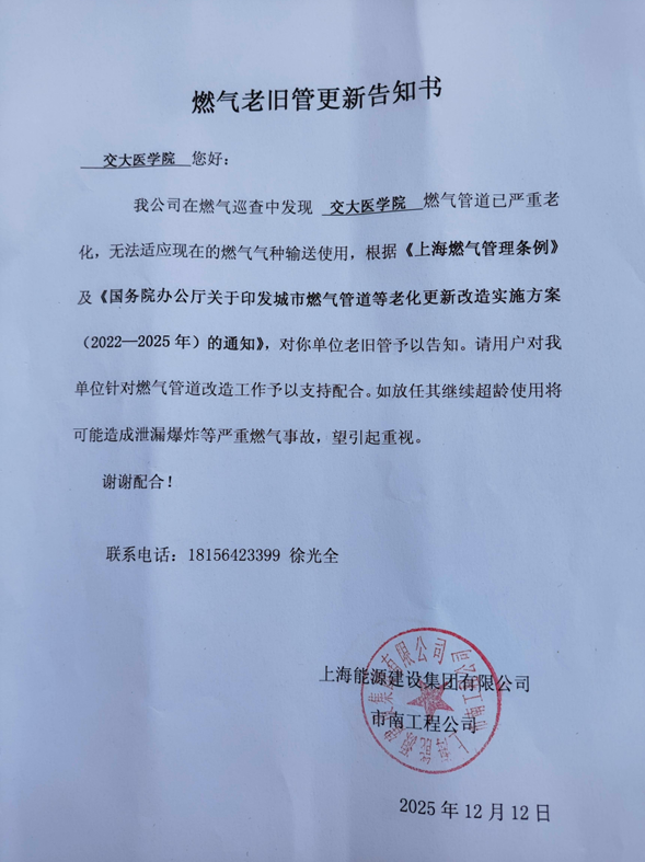 通知公告 当前位置: 首页 >> 通知公告 关于黄浦校区燃气管道更换的施工通知 作者:浏览量:时间:2025-12-15 医学院师生员工: 接上海大众燃气有限公司通知,为保障用气安全,需对东院、西院门口老旧燃气管道进行更换,定于2025年12月19日(周五)至12月20日(周六)对西院校门口燃气管道进行更换,于2025年12月20日(周六)至12月21日(周日)对东院校门口燃气管道进行更换,施工期间东院、西院均有约一小时的停气时间。请相关部门做好准备,造成不便,敬请谅解。如需联系,请致电63846590*778001。 特此通知。 资产管理处 2025年12月15日