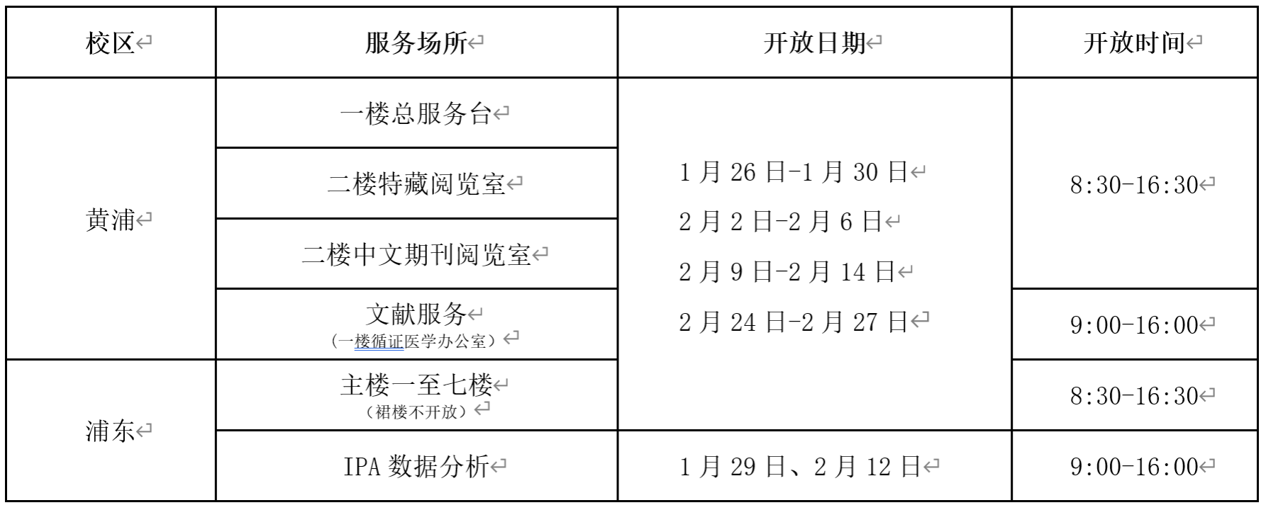 通知公告 当前位置: 首页 >> 通知公告 图书馆2026年寒假开放时间 作者:浏览量:时间:2026-01-20 友情提示: 1.根据学校安排,图书馆2026年1月26日至2026年2月27日执行寒假作息时间,开放时间为每周一至周五8:30-16:30。图书馆内各场地 (含班导师室、演讲厅、小组讨论室、多人静音仓等)及其他服务均暂停使用。 2.因春节调休,2月14日(周六)开放时间为8:30-16:30,2月28日(周六)按工作日时间开放(8:00-22:00),3月1日起恢复正常开放。 3.总服务台电话:776489。 上海交通大学医学院图书馆 2026年1月20日