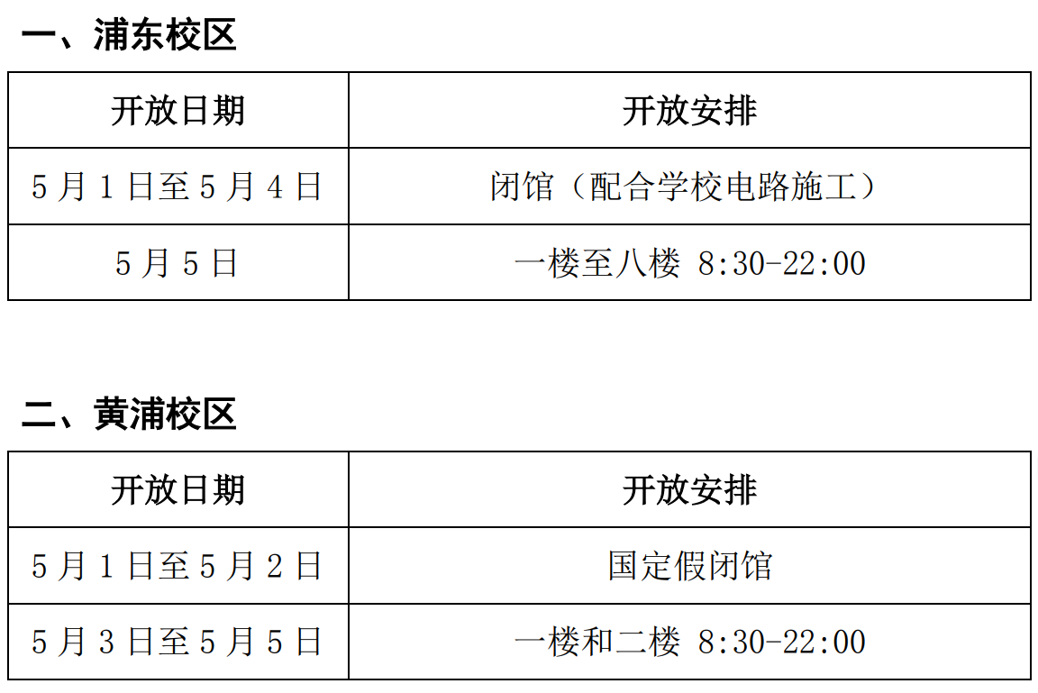 通知公告 当前位置: 首页 >> 通知公告 图书馆关于2026年“五一”劳动节开放安排的通知 作者:浏览量:时间:2026-04-29 各位读者: 根据学校2026年“五一”劳动节统一安排和《关于浦东校区供电平衡的停电通知》,5月2日至4日因浦东校区高压配电设施平衡施工全楼停电,为确保停电施工期间人员及财产安全,图书馆在此期间闭馆,给您带来的不便敬请谅解。 图书馆五一期间开放安排如下: 附:《关于浦东校区供电平衡的停电通知》https://www.shsmu.edu.cn/news/info/1023/30350.htm 上海交通大学医学院图书馆 2026年4月29日