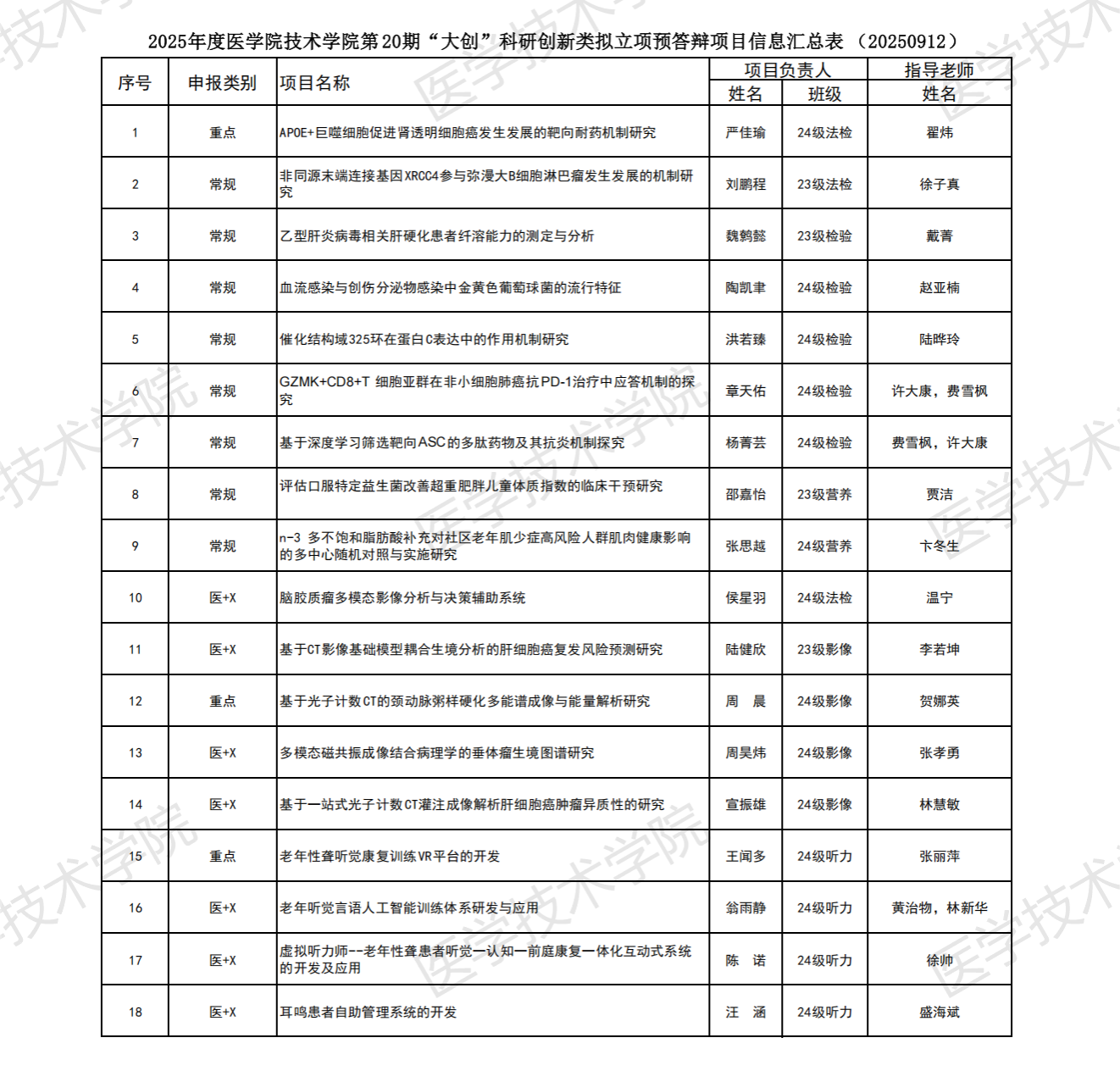 本次学生科创项目预答辩活动,不仅是对项目阶段性研究成果的规范性评审,更是一场聚焦科研思维锤炼、技术路径优化与学术表达提升的高质量科研实训与精准指导会。活动深度践行了医学技术学院以“科研育人”为核心的人才培养理念,集中体现了学院对学生科技创新能力体系化培育的高度重视与系统规划。后续,学院将进一步完善学生科创项目“全周期培育支持体系”,以需求为导向激发学生科研创新内驱力,着力培养一批具备扎实医学技术理论功底、突出科研创新能力与较强临床转化思维的卓越医学技术人才,为我国医学技术领域的创新发展储备核心力量。