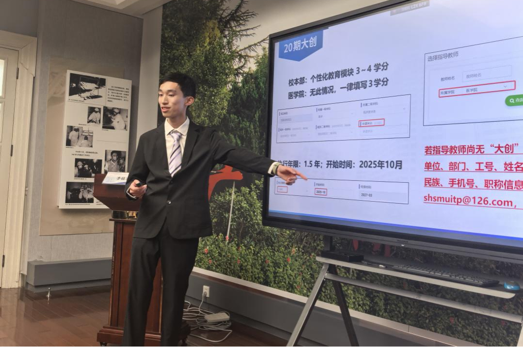 9月12日下午,医学技术学院大学生创新训练计划(以下简称“大创”)第20期科研创新类拟立项预答辩在瑞金医院院史馆2楼1号与3号会议室圆满举行。此次活动旨在为即将申报上海交通大学医学院第20期“大创”科研创新类及医学技术学院“云骥计划”的项目团队提供一个展示与打磨的平台,帮助同学们在专家指导下完善研究设计、凝练创新点,为后续正式立项答辩奠定坚实基础。出席活动的专家和老师包括:医学技术学院党委副书记、副院长徐勤毅,学院党委委员、学术委员会副主任、智能医学技术系负责人夏振炜,瑞金医院检验科科副主任彭奕冰,第九人民医院耳鼻咽喉头颈外科行政副主任陈颖,医学检验技术系研究员徐艳艳,临床营养系副教授贾洁,医学影像技术系副研究员夏威,以及学院“大创”项目管理者徐培青老师等。