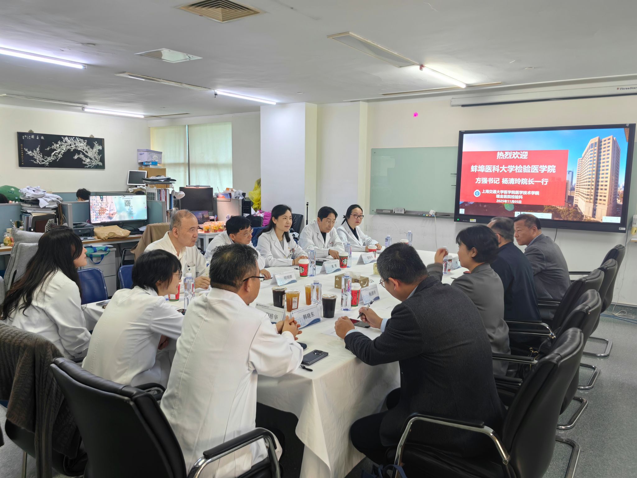 11月5日下午,蚌埠医科大学检验医学院党委书记方强、院长杨清玲、党委副书记梅传忠、年级主任韩晓东一行赴学院开展学习交流,学院学术委员会主任胡翊群、党委书记袁青、副院长/医学检验技术系主任王学锋、学术委员会副主任/智能医学技术系主任夏振炜等党政领导班子、职能部门及系(专业)负责人参加会议。
