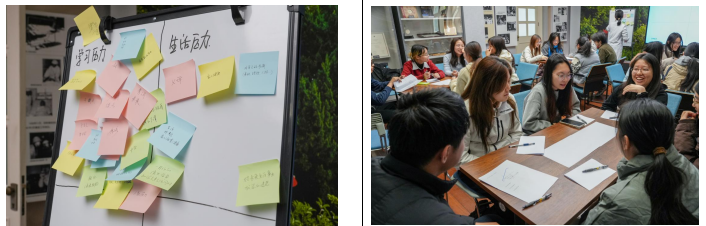 紧接着,“压力源分类卡”活动将同学们带入了压力的微观世界。大家头脑风暴,将生活中的压力来源一一罗列在便利贴上,并在白板上按照“学习压力”“科研压力”“工作压力”“生活压力”进行分类。这一过程不仅让压力变得具体、可视化,还让大家发现压力的共性与个性,意识到清晰认识压力来源是应对压力的关键一步。