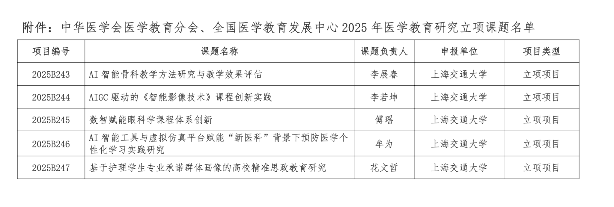 为适应第四代医学教育改革,深入探讨在新科技革命进程中医学教育创新发展的新路径、新范式,提升医学教育的质量和效果,中华医学会医学教育分会和全国医学教育发展中心联合开展“2025年度医学教育研究课题”立项工作。医学影像技术系李若坤老师申报的《AIGC驱动的<智能影像技术>课程创新实践》项目,在激烈评审中脱颖而出,成功立项。
