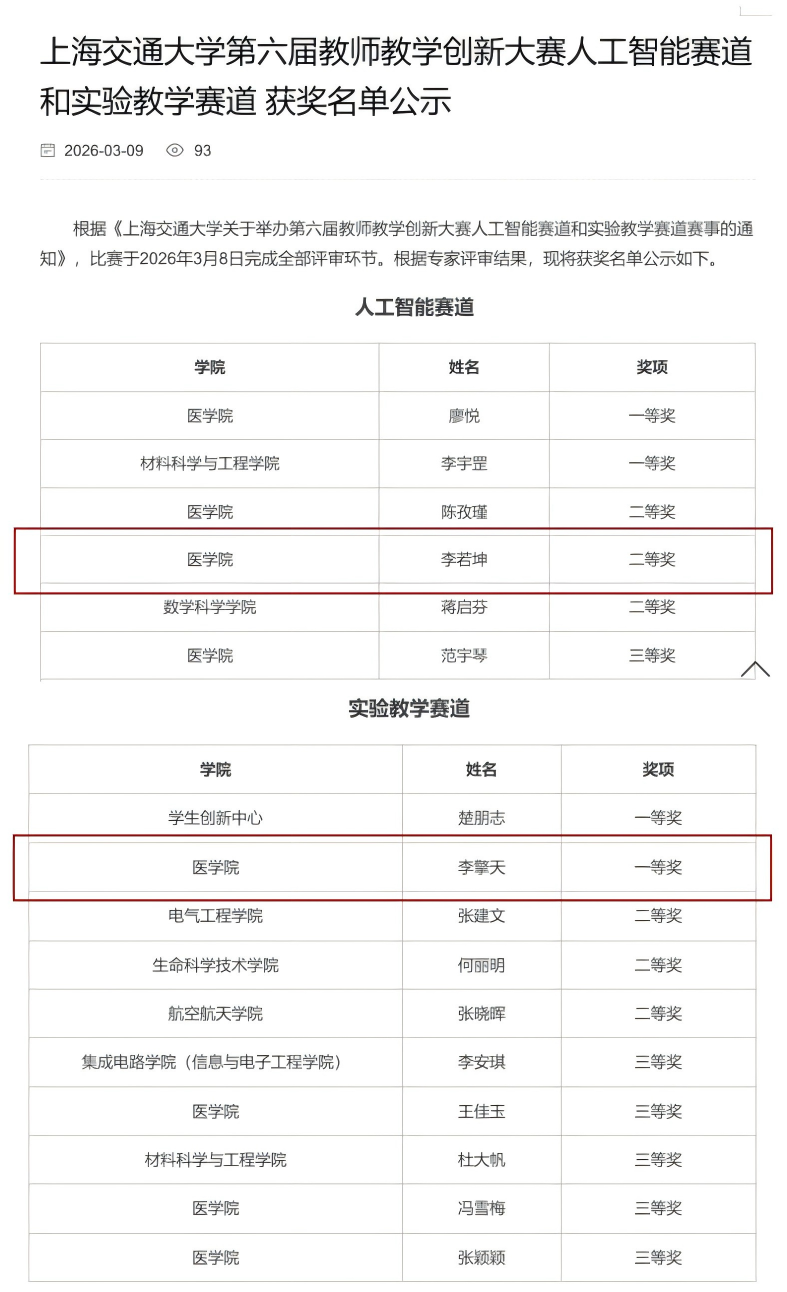 近日,由上海交通大学主办的“第六届教师教学创新大赛”圆满落幕。我院参赛团队凭借卓越的教学改革成果,在激烈的角逐中脱颖而出,首次在实验教学赛道荣获一等奖,同时在人工智能赛道荣获二等奖。这一突破,不仅填补了学院在该赛事高教主赛道的获奖空白,更标志着我院在深化产教融合、推动数智化教学改革方面迈上了新台阶。同时,恭喜李擎天团队成功进入上海市第六届高校教师教学创新大赛决赛。