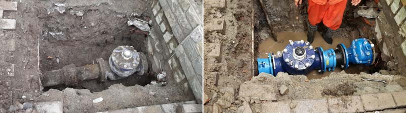 为配合自来水公司远程抄表系统改造,2014年8月28日自来水公司对我院4只大口径自来水总表(东校区:重庆南路227号大门口、合肥路校门口、淡水路浴室后;西校区:重庆南路西3教学楼旁)进行了更换。物资管理中心提前通知各个相关部门做好停水准备,并关闭了学院内的相关环通阀,以配合自来水公司施工。当天物资管理中心在协助自来水公司施工时,发现了我院水管可能存在的一个问题,已上报领导,并安排专业人员检查。